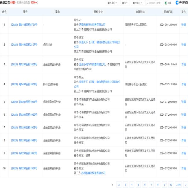 据天眼查法律诉讼信息显示,奇瑞徽银汽车金融股份有限公司(以下简称“奇瑞徽银汽车金融”)因金融借款合同纠纷被告,于2024年8月1日在安徽省芜湖市经济开发区人民法院开庭审理【案号:(2024)皖0291民初1809号】。